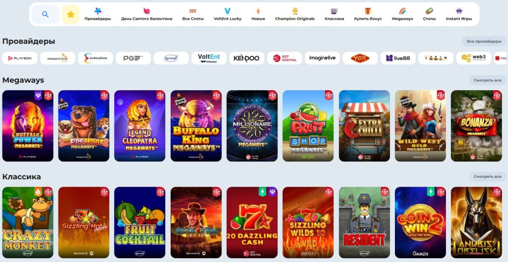 Игровая библиотека Champion Casino насчитывает более 4000 тайтлов от 100+ провайдеров — от классических ретро-автоматов до масштабных Live-шоу с живыми ведущими. Каталог регулярно пополняется новинками.